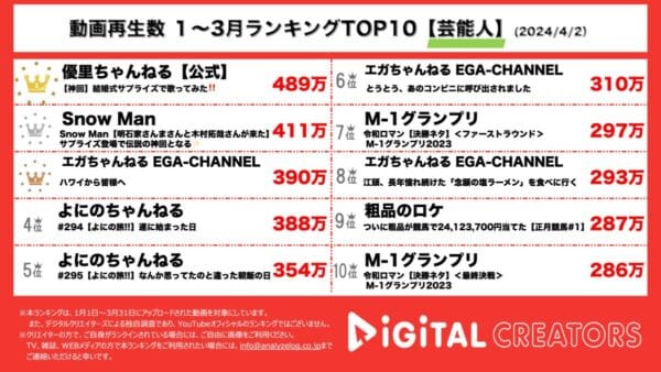 今回のランキングでは『SnowMan』が2本ランクイン、『エガちゃんねる EGA-CHANNEL』と『よにのちゃんねる』はそれぞれ3本ランクインと安定した人気を見せた。
