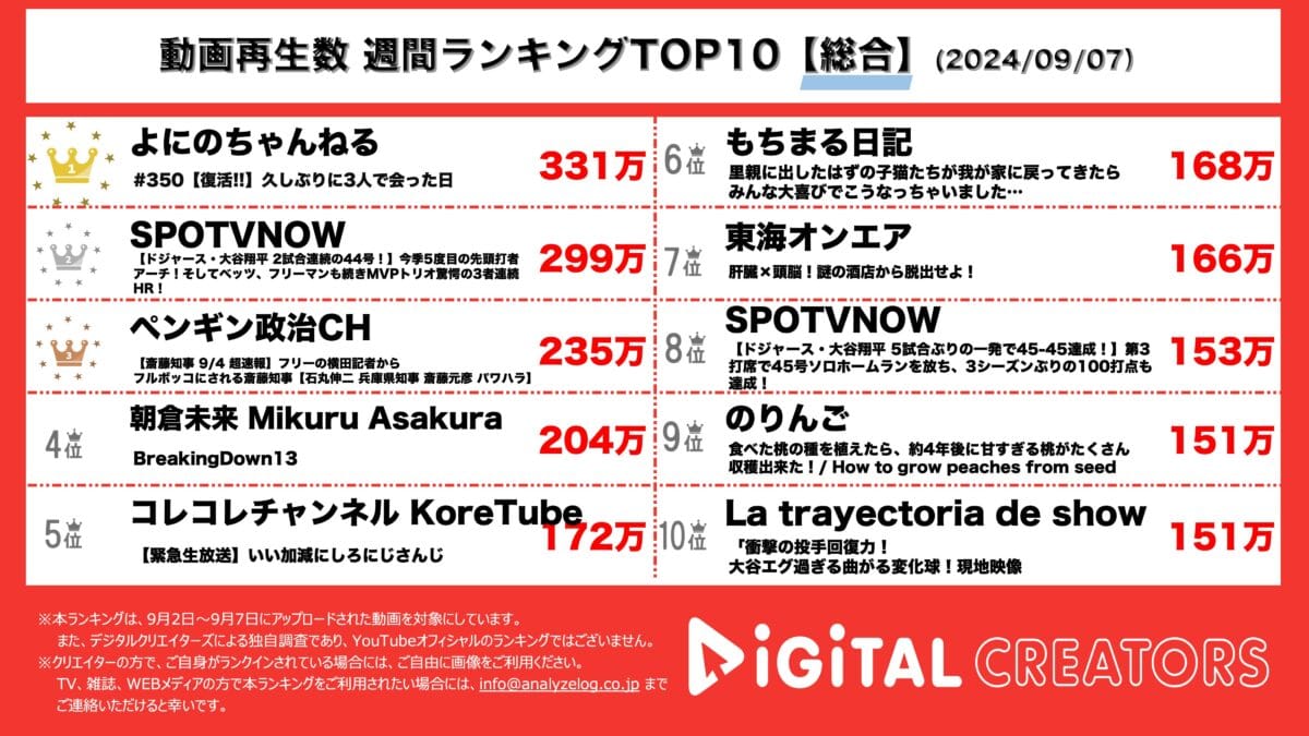 今回は9月1日~9月7日にYouTubeで公開された動画ランキングTOP10を発表。(9月8日集計)