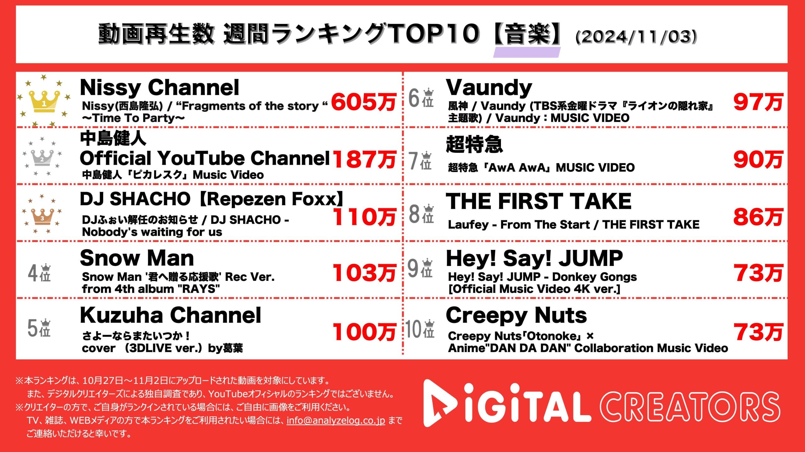 1位を獲得したのは『Nissy Channel』。10月18日にデジタルリリースされたニューアルバム「HOCUS POCUS 4」に収録されている「Time To Party」のMVが公開された。