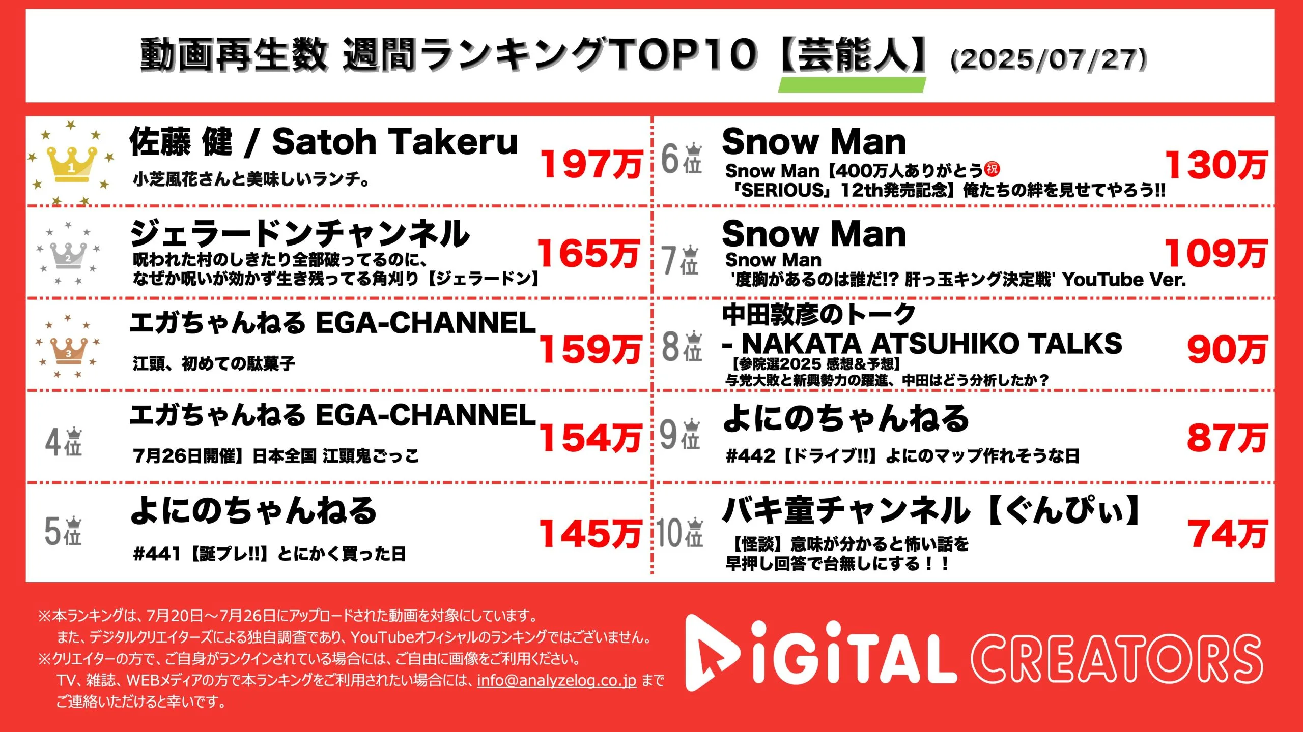 今回は7月20日~7月26日にYouTubeで公開された動画ランキングの芸能人TOP10を発表。(7月27日集計)