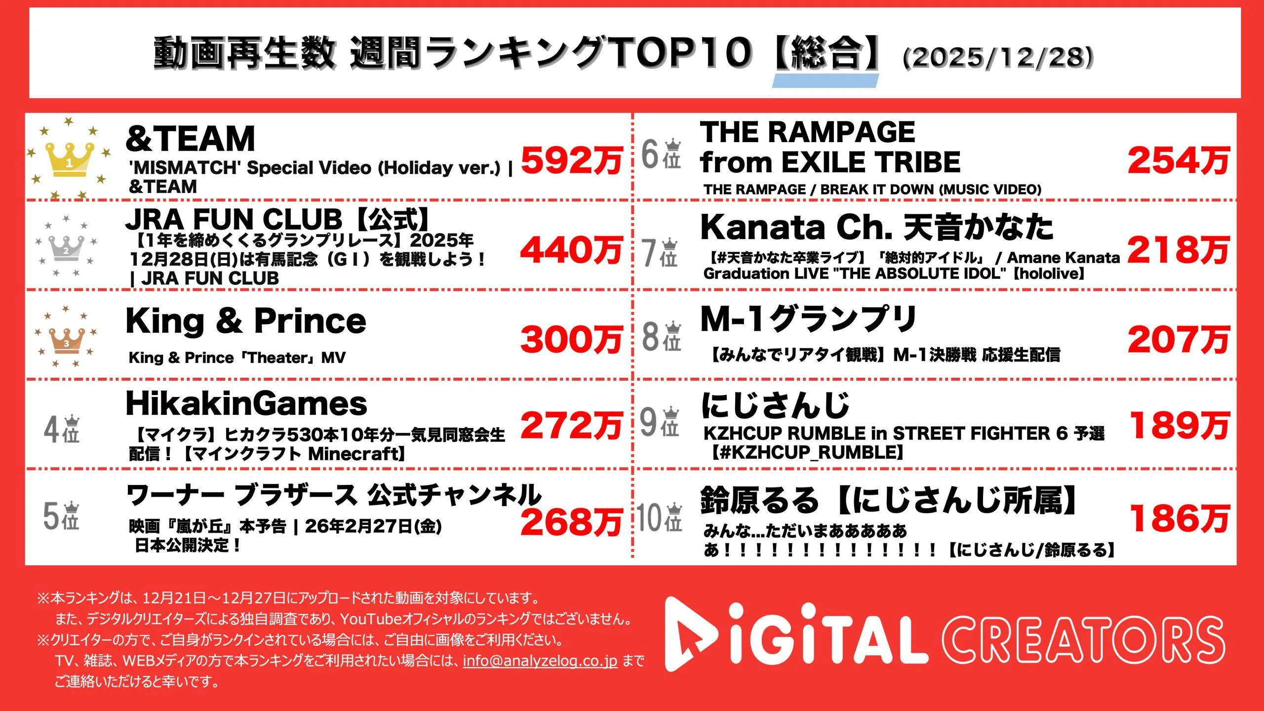 週間YouTube再生回数総合ランキング発表!&TEAM、パジャマ姿でMISMATCHを披露!有馬記念生配信が第2位!キンプリ、THEATERのおしゃれMVも!
