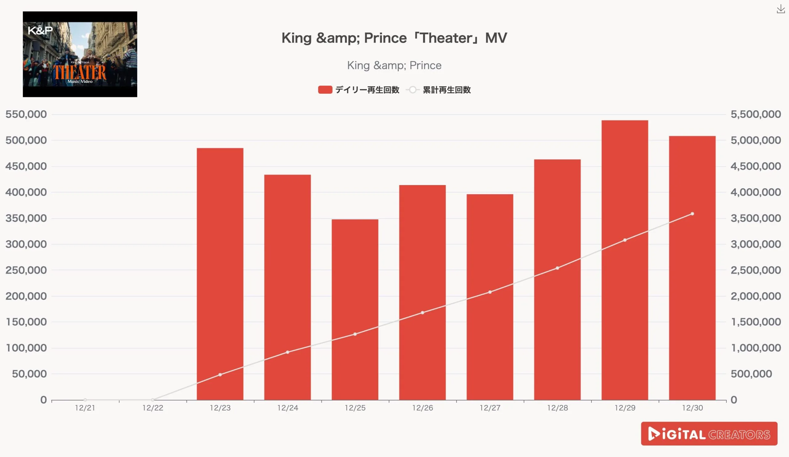 2025年12月24日に発売されたKing&Princeの7枚目となるアルバム「STARRING」に収録されている「THEATER」のMVが3位にランクイン。