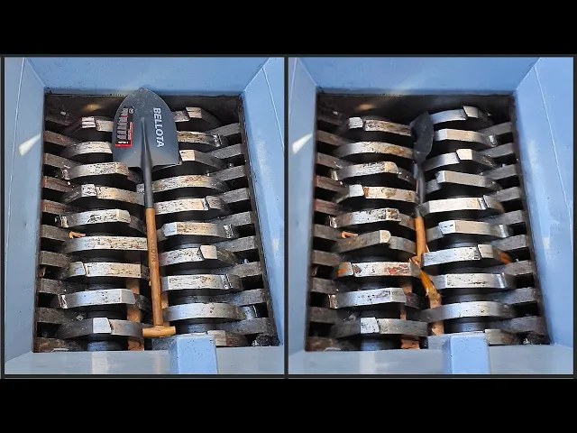 200 馬力の巨大シュレッダーでシャベルやその他の器具などを細断します。