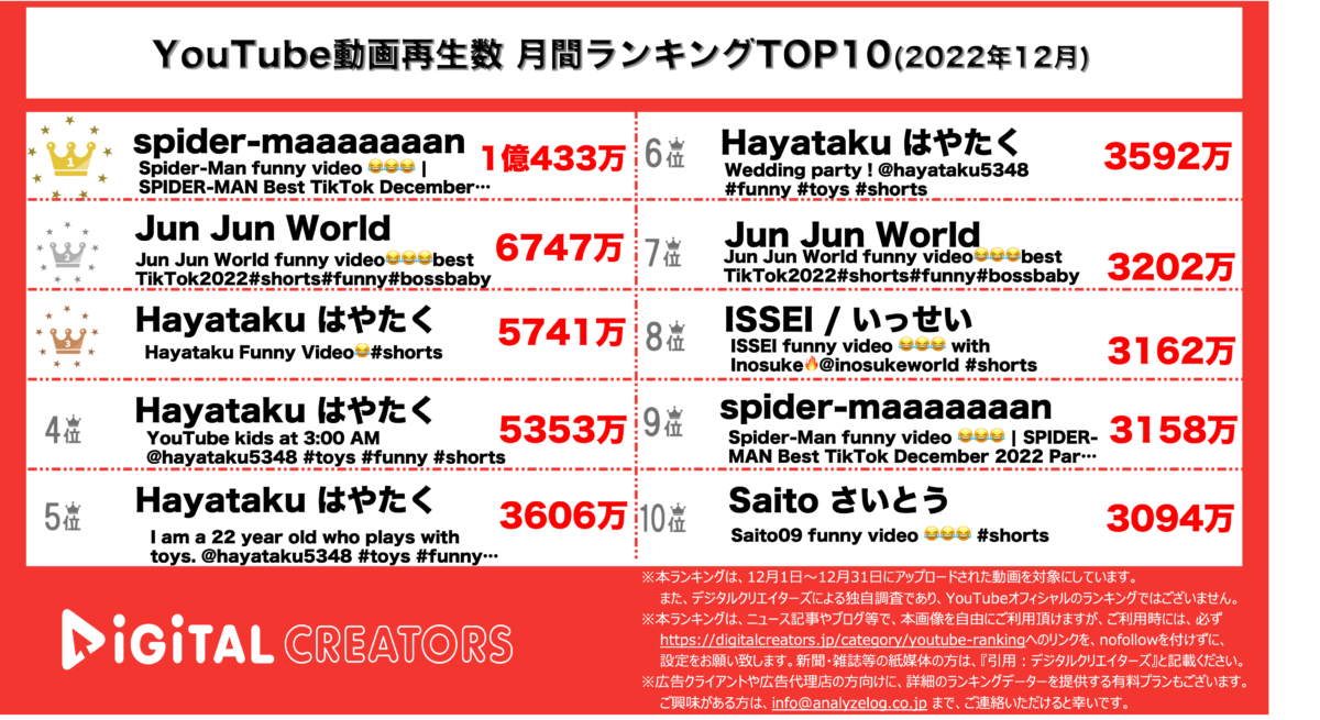 『Jun Jun World』は2位(6747万再生)、7位(3202万再生)、『Hayataku はやたく』は3位(5741万再生)、4位(5353万再生)、5位(3606万再生)、6位(3592万再生)にランクインしている。
