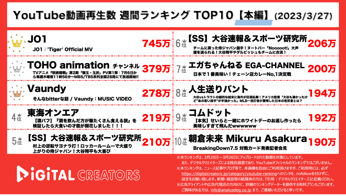 【YouTubeランキング】週間動画再生数~JO1のMV1位/大谷翔平らWBC関連動画~(3月27日)