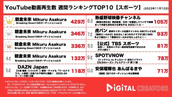 今回は、11月5~11日にスポーツYouTuberチャンネルで公開された動画の週間ランキングTOP10を発表(11月12日集計)。