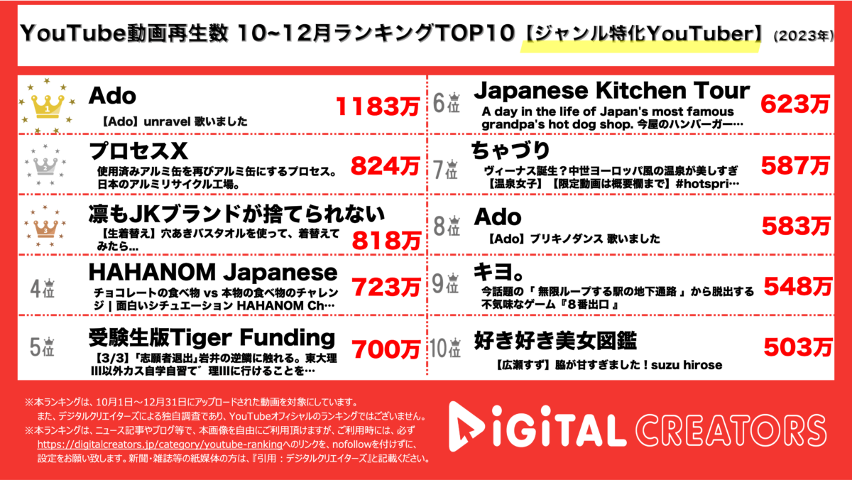 今回は10月1日~12月31日にジャンル特化YouTubeチャンネルで公開された動画の週間ランキングTOP10を発表。(1月1日集計)