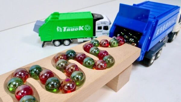 木製の素ローブと車のおもちゃを組み合わせ、あらゆる方法でビー玉を転がしたり、運んだしして遊んでいる様子が映しだされている。木製のローブに転がした際など、ビー玉同士がカチカチとぶつかり合う音が聞いていて心地よい。