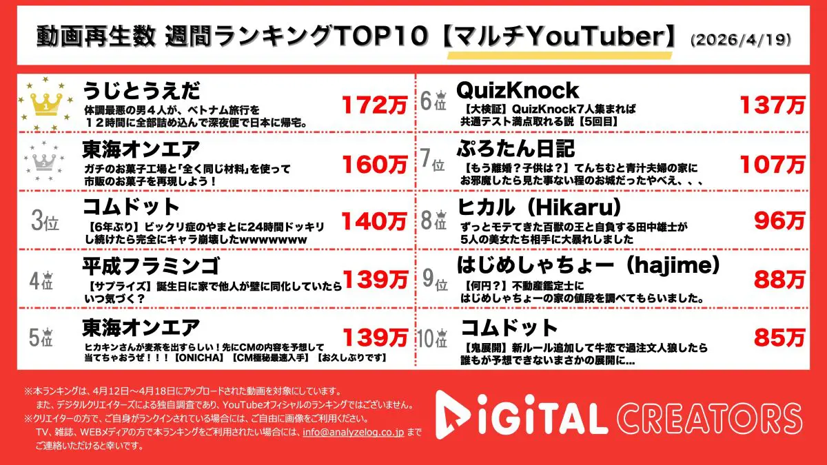 今回は4月12日~4月18日にYouTubeで公開されたマルチYouTuber動画ランキングのTOP10を発表。(4月19日集計)