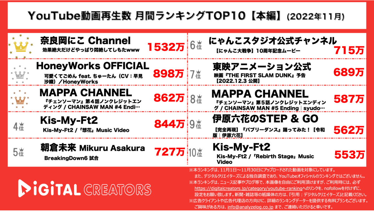 【YouTubeランキング】月間動画再生数~奈良岡にこ1位/キスマイ2動画TOP10入り~<11月>