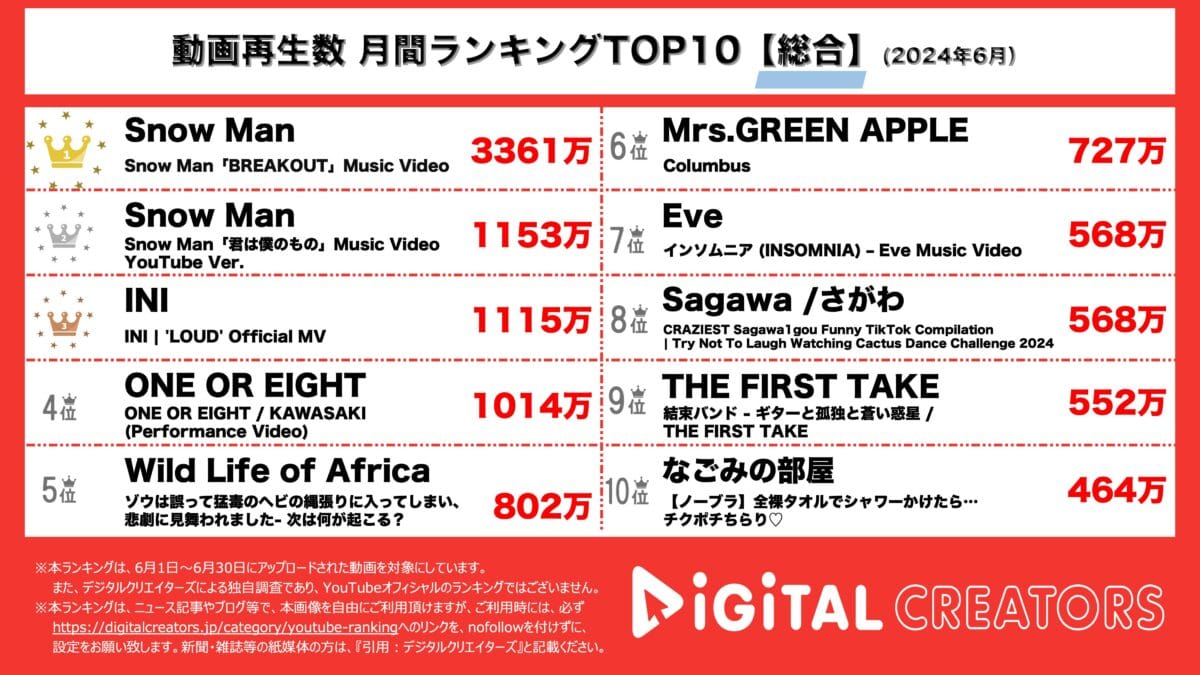 今回は、6月1日~6月30日にYouTubeチャンネルで公開された動画ランキング(総合)TOP10を発表。(7月2日集計)。