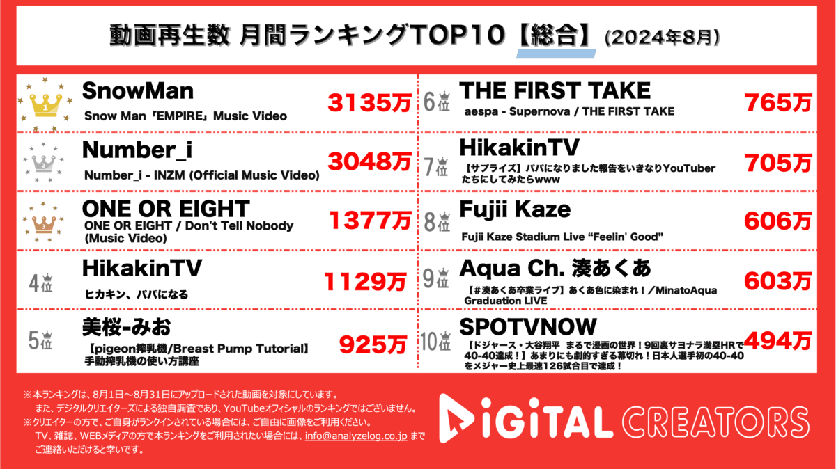 今回は、8月1日~8月31日にYouTubeで公開された動画ランキングTOP10を発表。(9月1日集計)