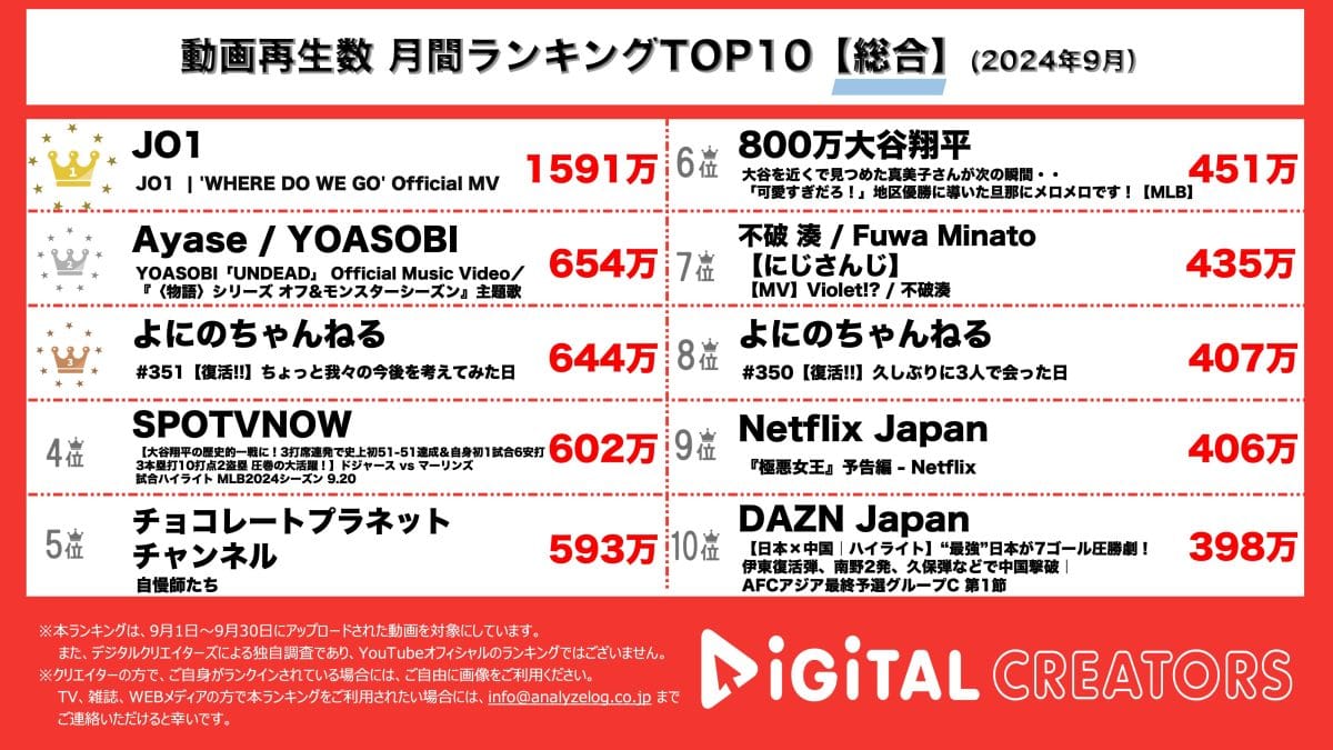 今回は、9月1日~30日に公開された動画の再生回数ランキングTOP10を発表。(10月1日集計)