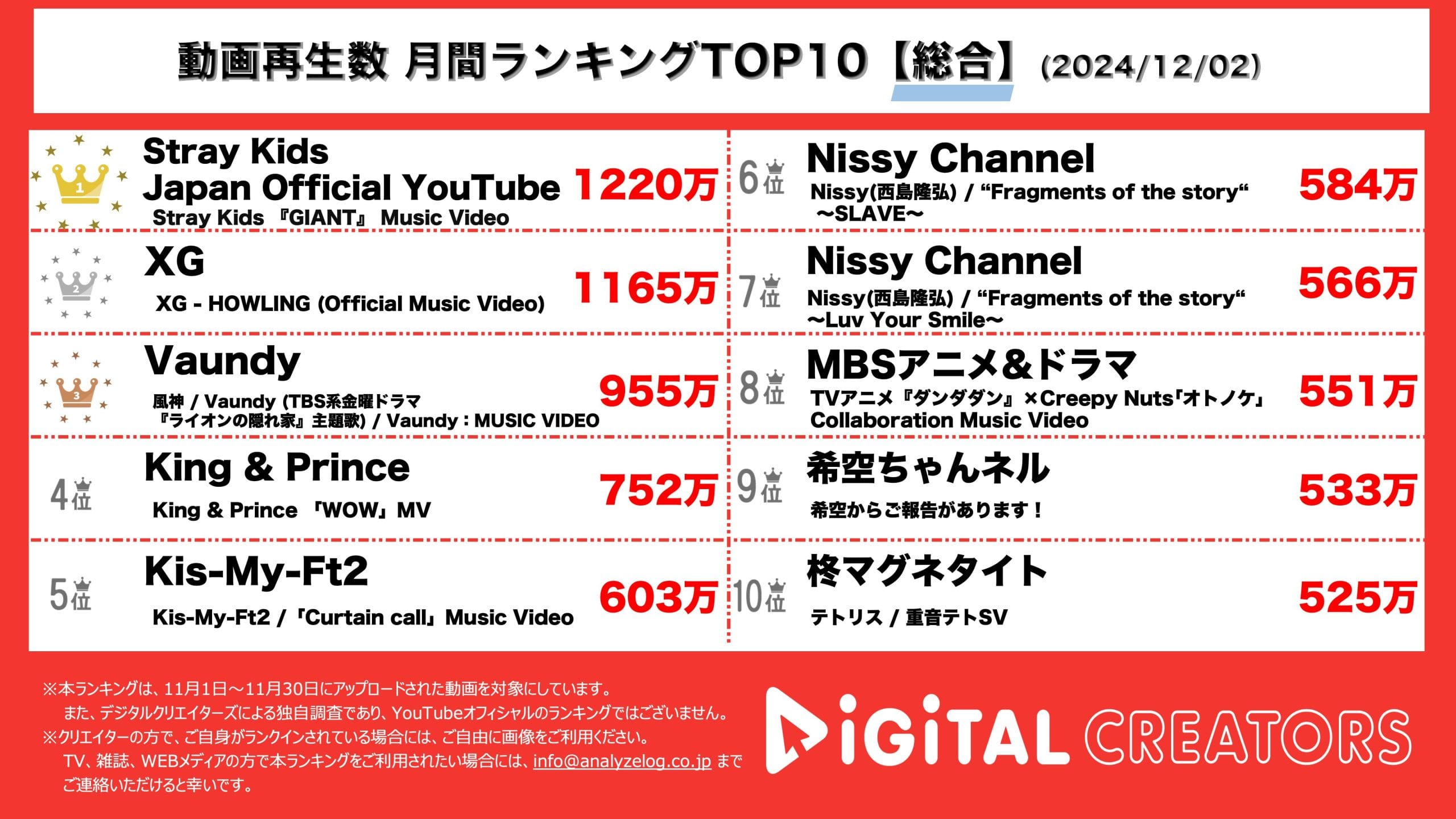 今回は、11月1日から11月30日にYouTube上で公開された動画の総合ランキングを発表。(12月2日集計)