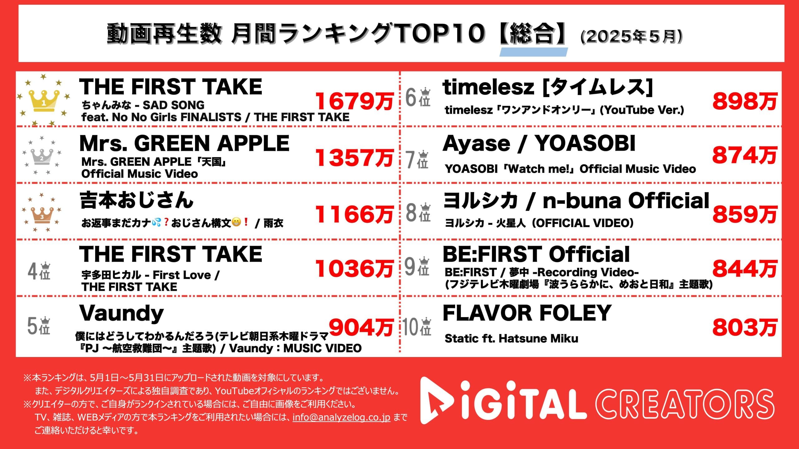 『THE FIRST TAKE』は4位にもランクインしており、宇多田ヒカルの「First Love」が大きな話題を集めたほか、6位には『timelesz [タイムレス]』、7位には『Ayase / YOASOBI』がランクインするなど、音楽系の動画がTOP10を独占した。