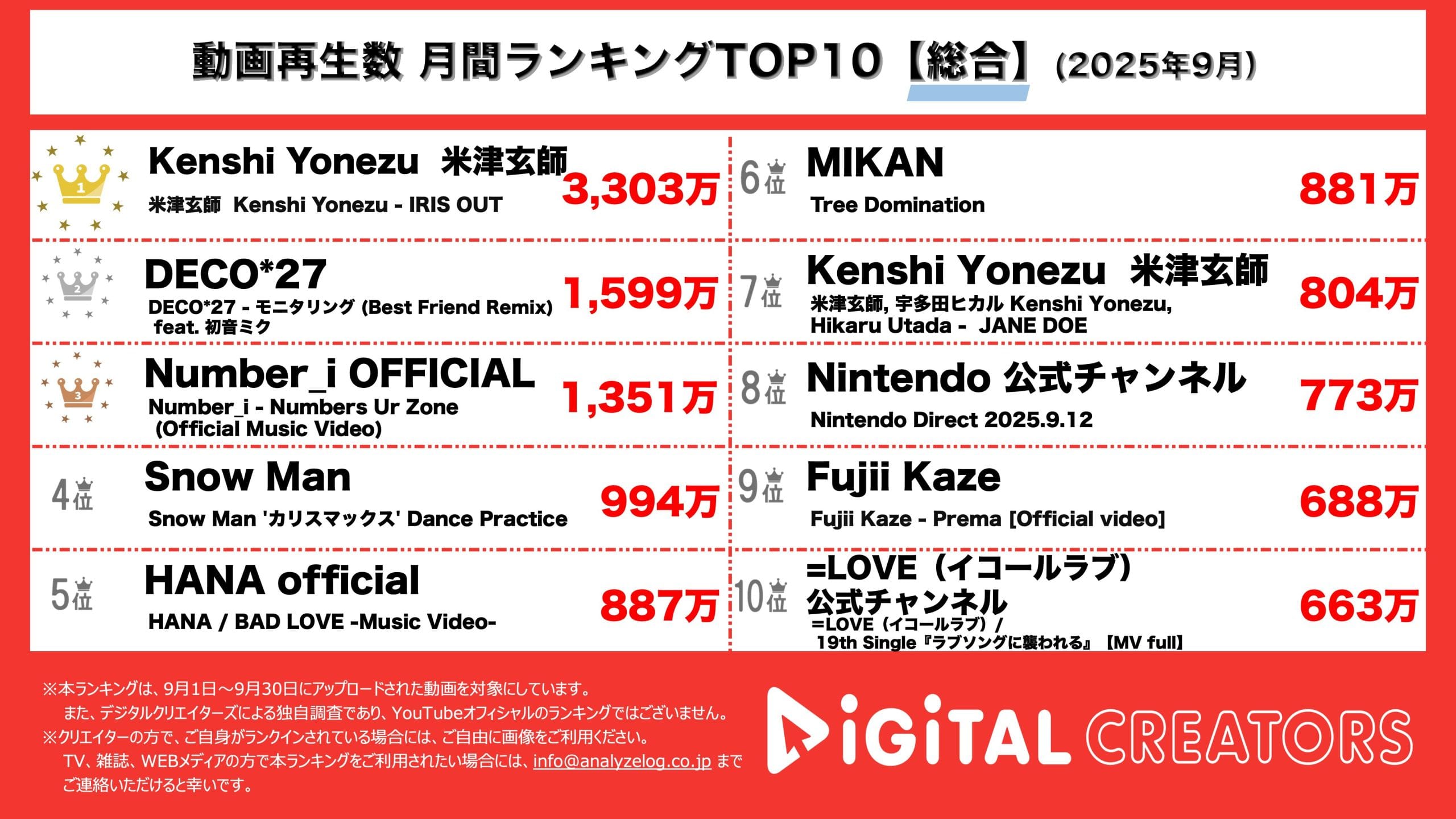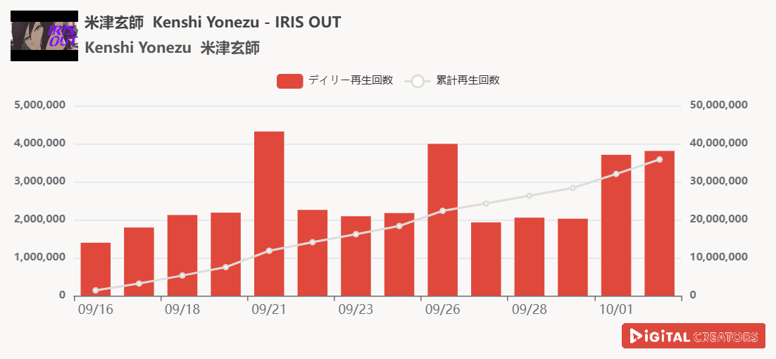 月間YouTube総合再生回数ランキングを発表!米津玄師、劇場版「チェンソーマン レゼ篇」主題歌「IRIS OUT」公開から半月で3300万回再生突破!バズり中「モニタリング」も解釈と音色を変え再登場!
