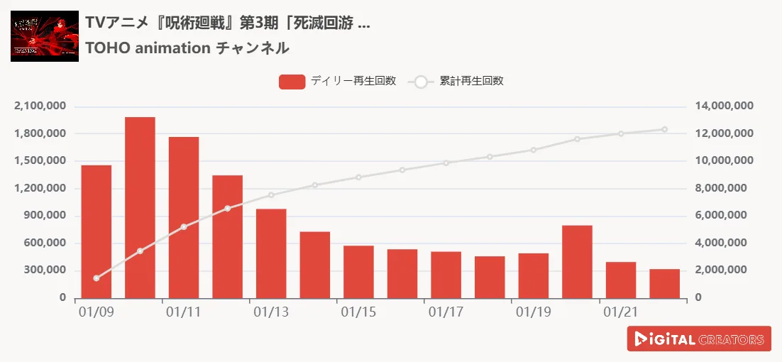 3位を獲得したのは獲得したのは『TOHO animation チャンネル』!大人気TVアニメ「呪術廻戦」の第3期「死滅回游 前編」のノンクレジットオープニングムービーが公開された。今期のオープニングテーマ曲であるKing Gnuの「AIZO」と合わせて配信された。