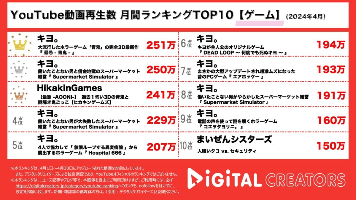 今回は、4月1日~4月30日にYouTubeで公開された、ゲーム動画ランキングTOP10を発表(5月1日集計)。