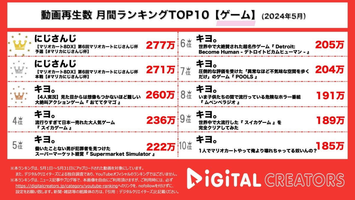 また、5月のゲーム動画ランキングTOP10のうち、8つをキヨが独占する結果となった。来月のランキングも彼が大半を独占するのか、はたまた他のYouTuberが登場するのかとても楽しみだ。