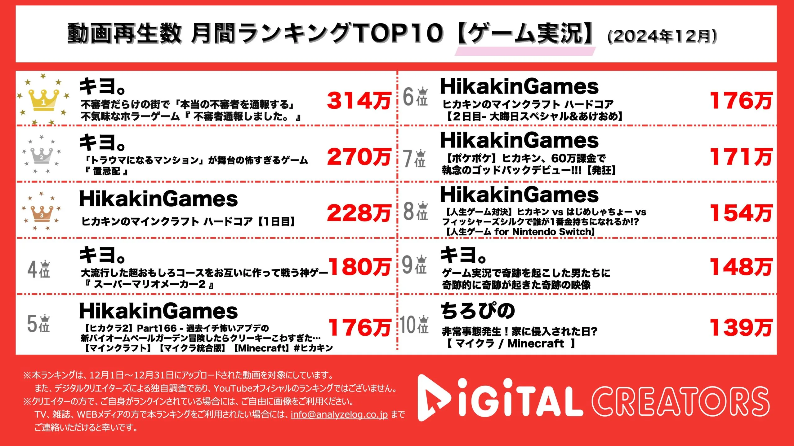 2024年12月月間YouTube再生回数 ゲームランキングを発表!キヨ。、Hikakinがランキングを占拠!