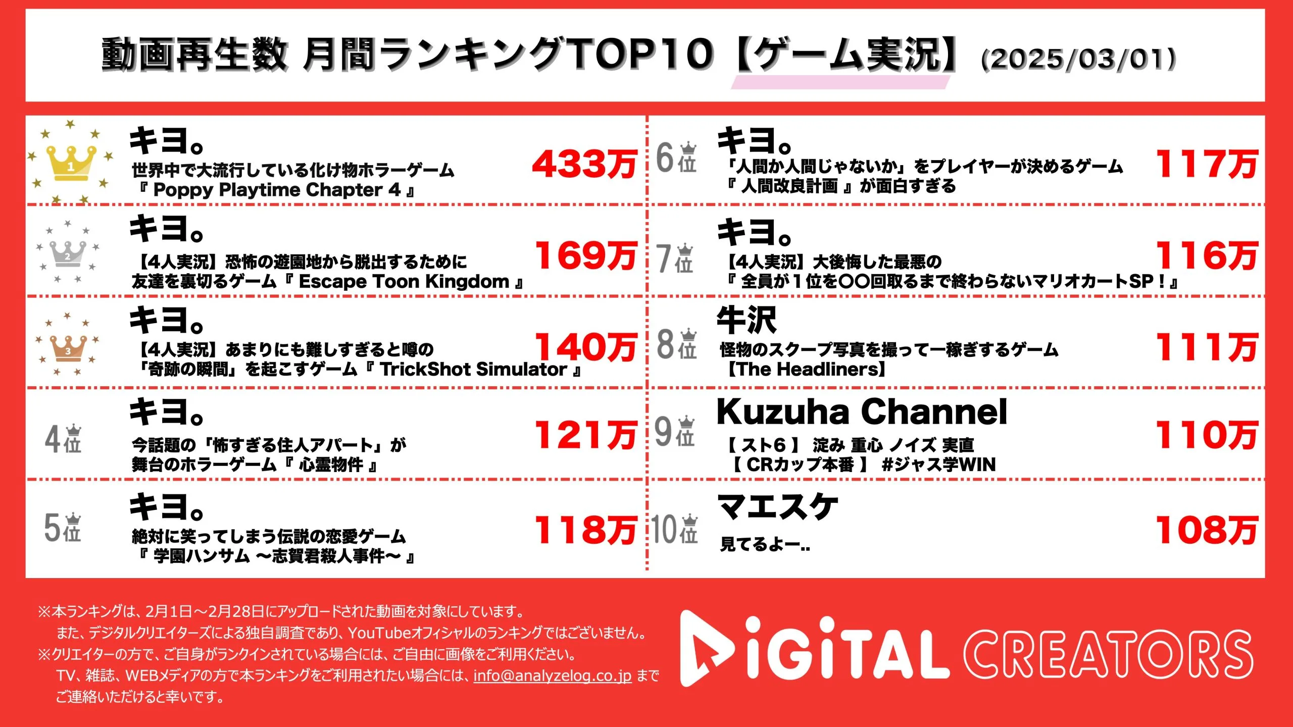 今回は2月1日~2月28日にYouTubeで公開された動画ランキングTOP10を発表。(3月1日集計)
