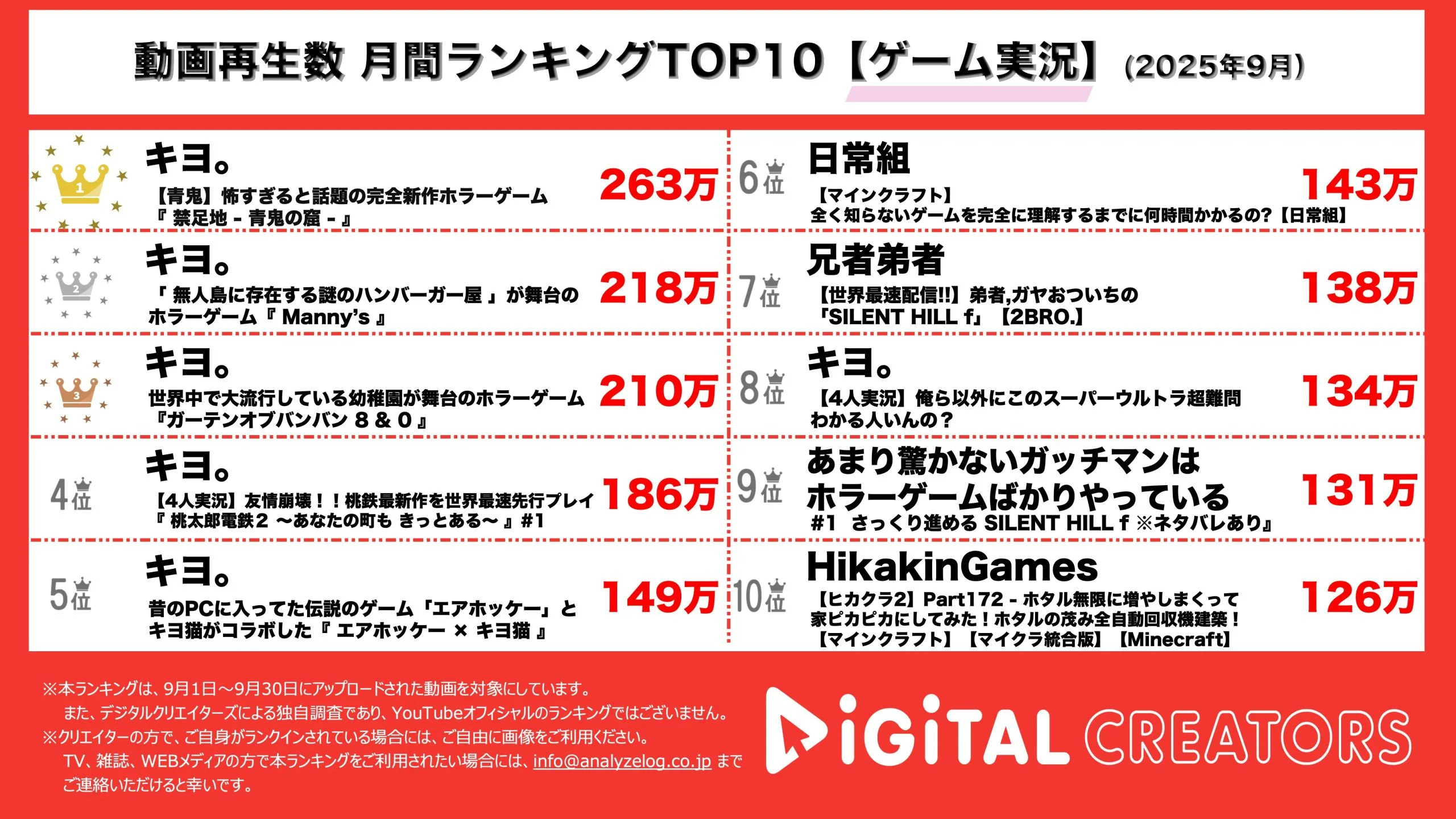 今回は9月1日~9月30日にYouTubeで公開された動画ランキングジャンル特化TOP10を発表。(10月1日集計)