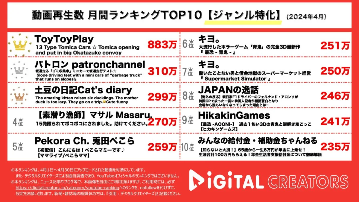 今回は、4月1日~4月30日にYouTubeで公開された、ジャンル特化YouTuber動画ランキングTOP10を発表(5月1日集計)。