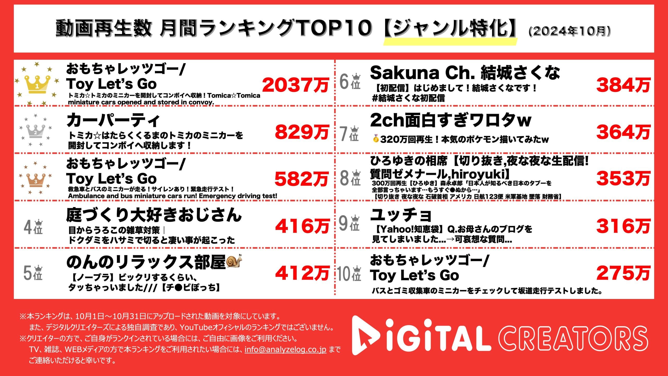 今回は、10月1日~10月31日にYouTubeで公開されたジャンル特化動画の再生回数ランキングTOP10を発表。(11月1日集計)