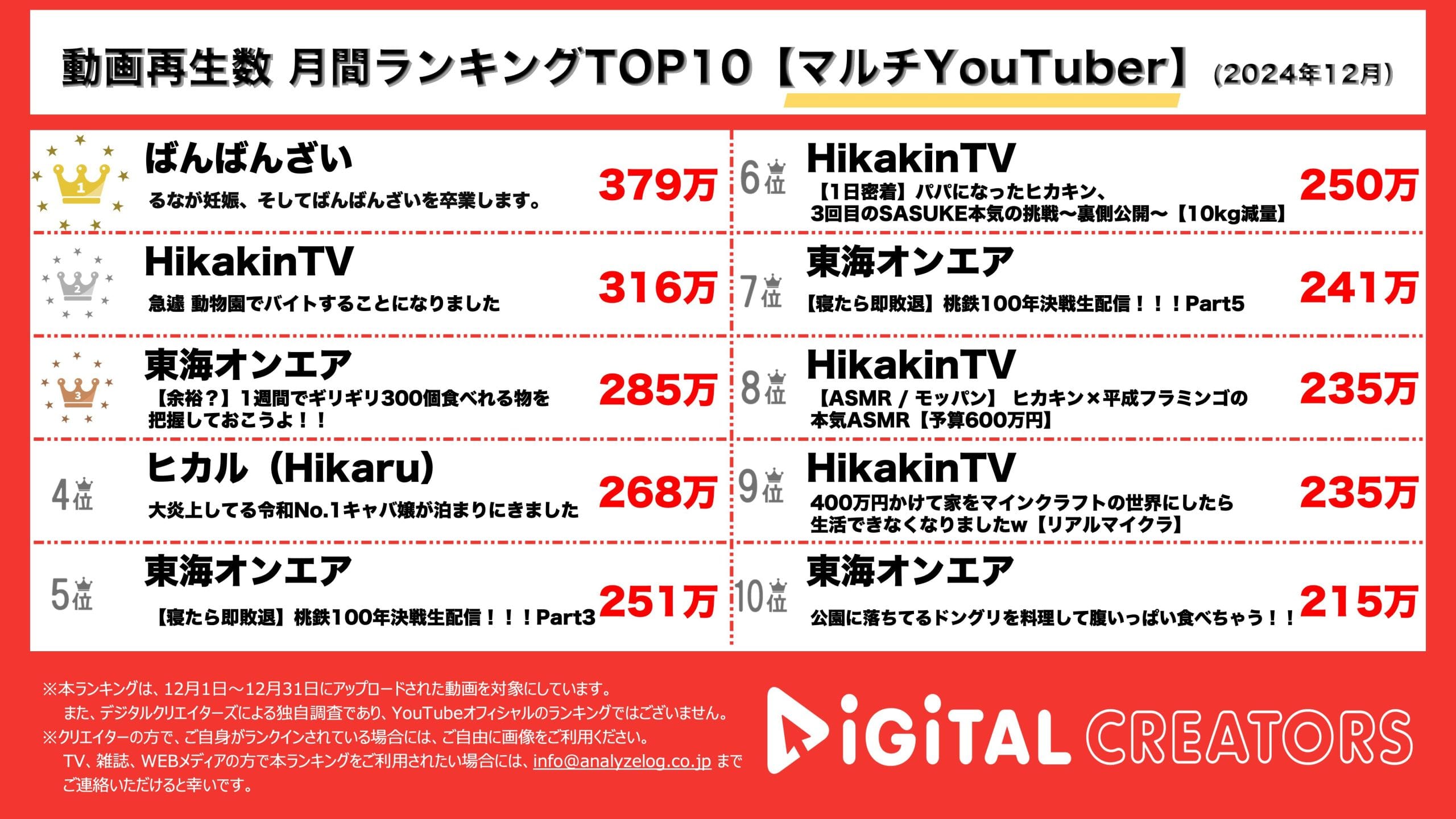 今回は、YouTubeにて12月1日から12月31日に公開された動画のマルチYouTuberランキングを発表。(1月7日集計)