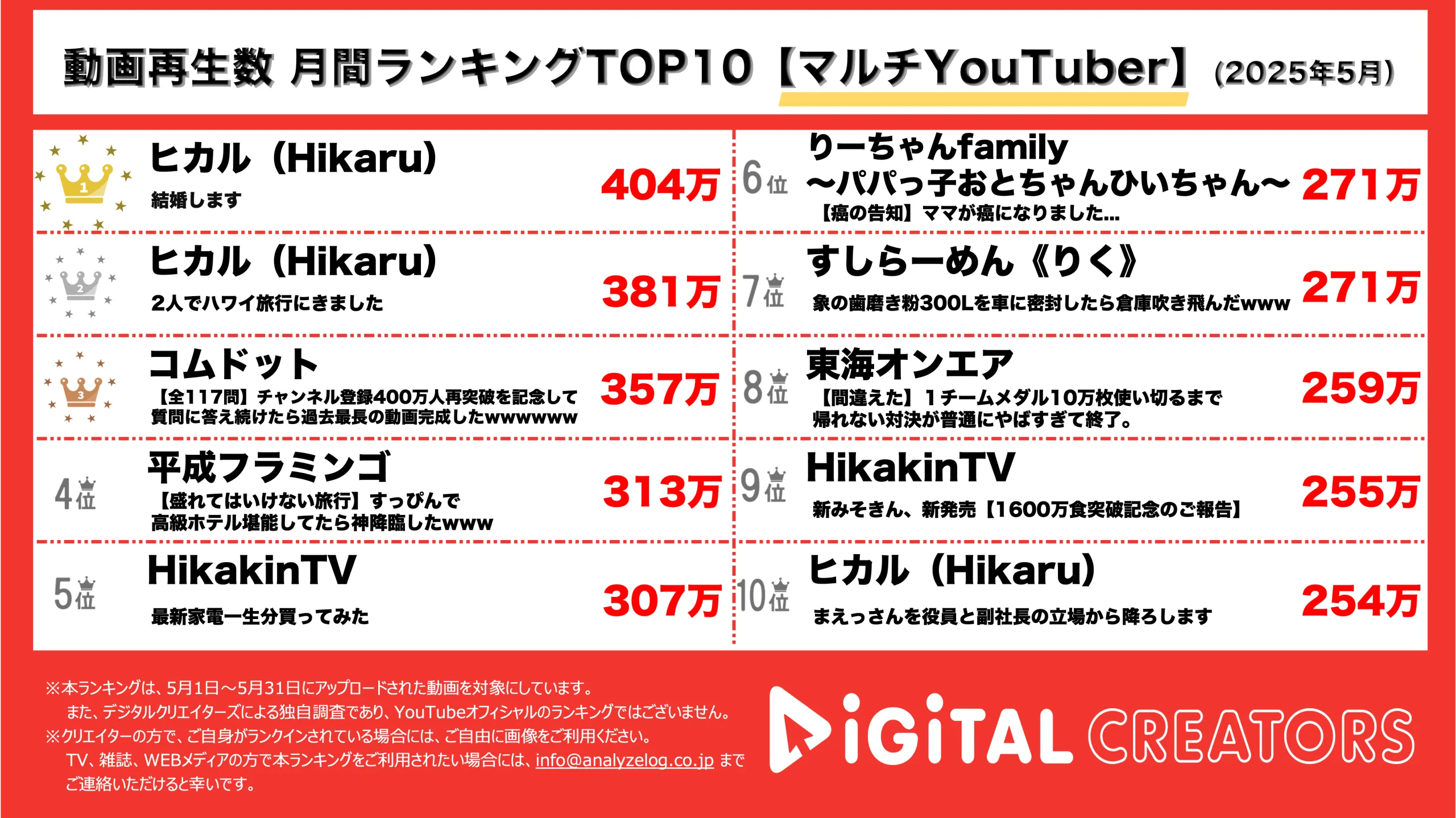 今回は5月1日~5月31日にYouTubeで公開された動画ランキングTOP10を発表。(7月6日集計)