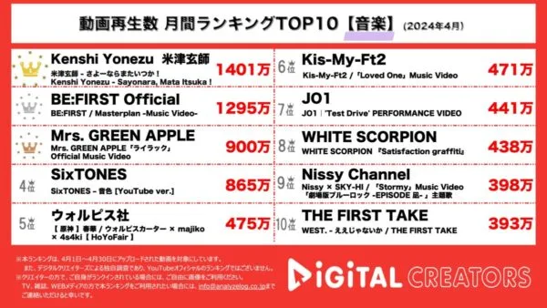 今回のランキングでは『BE:FIRST』『Kis-My-Ft2』『JO1』『WHITE SCORPION』『WEST.』といったダンス&ボーカルグループやアイドルの動画が多くランクインする結果となった。