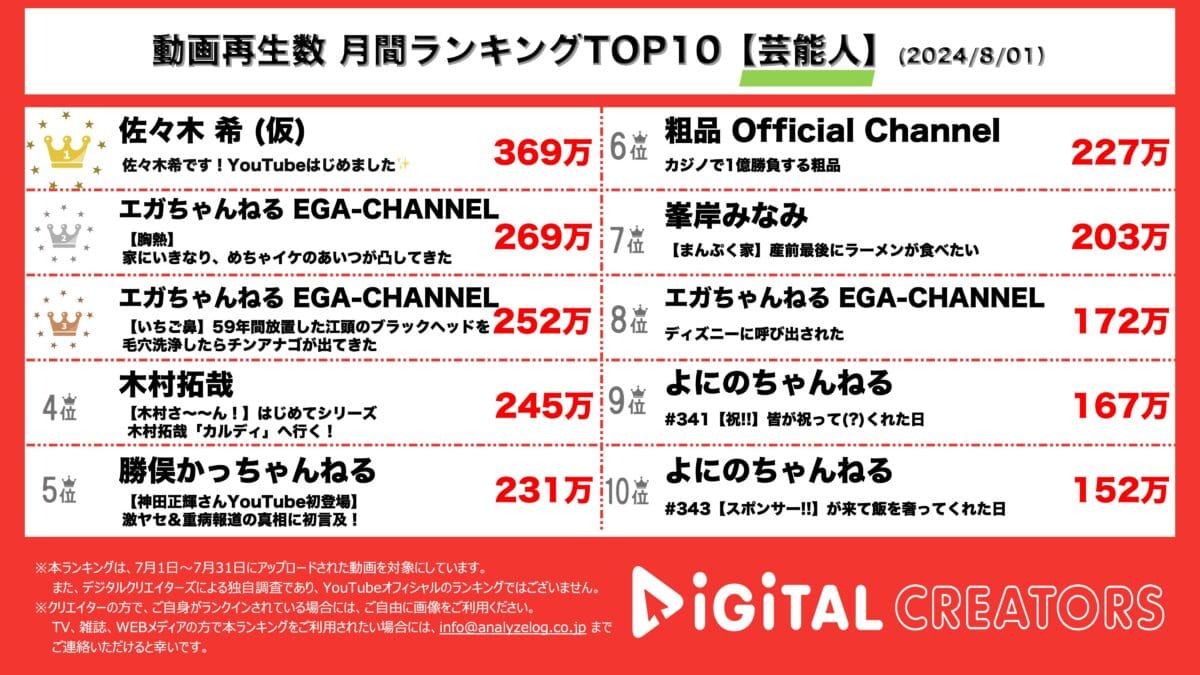 今回は、7月1日~7月31日にYouTubeで公開された芸能人動画の再生数ランキングTOP10を発表。(集計日8月1日)