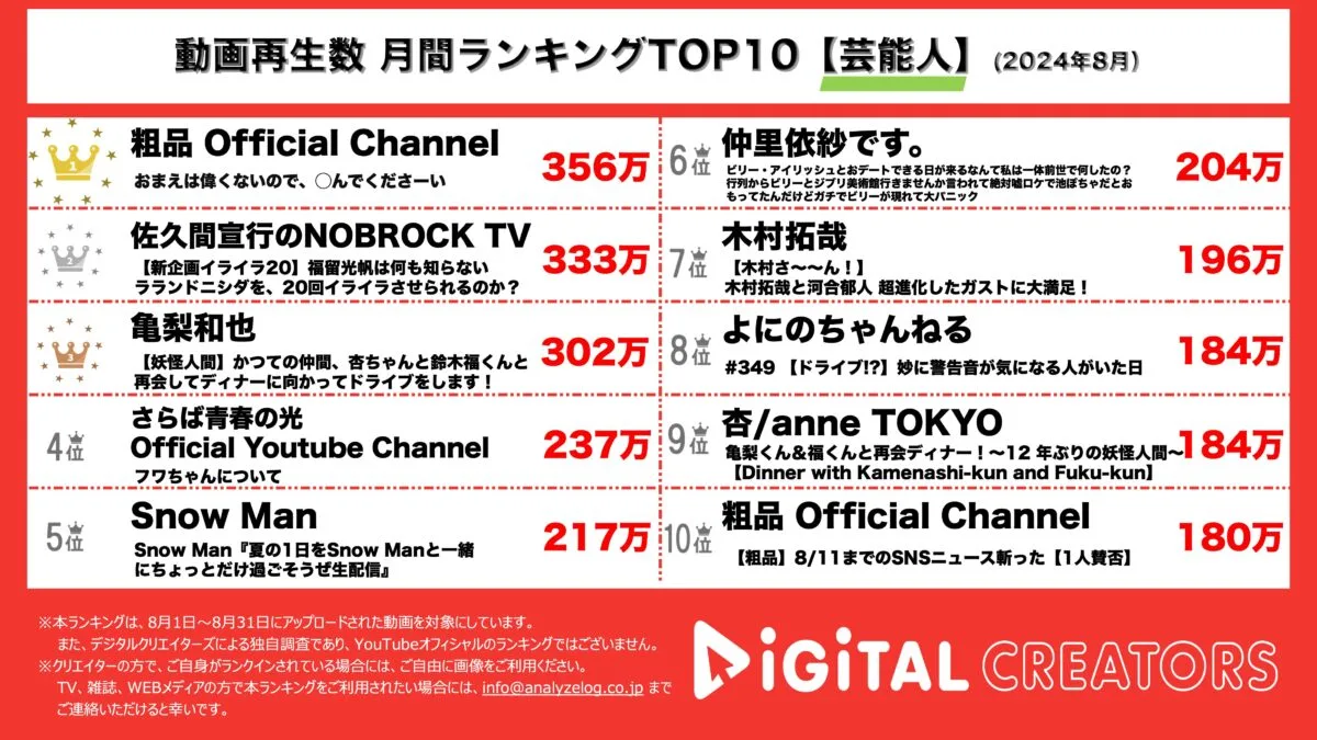 今回は8月1日-31日に公開された芸能人動画ランキングTOP10を発表。(9月1日集計)