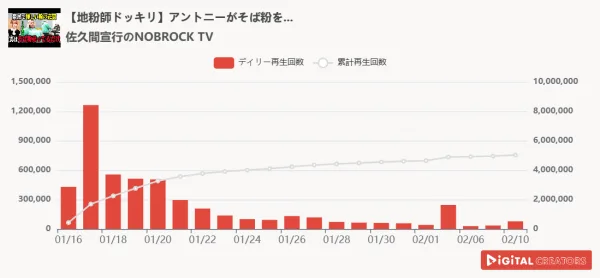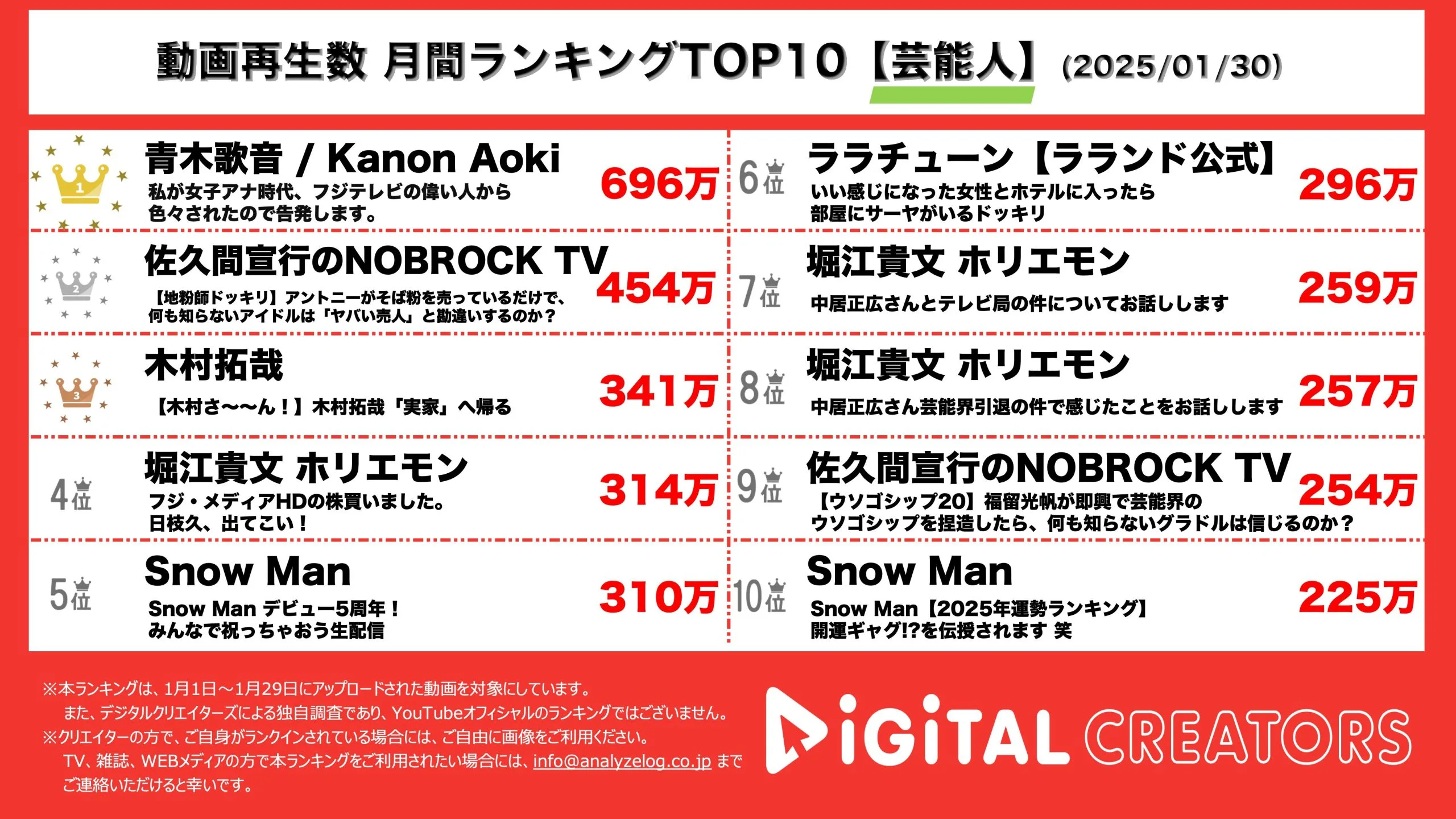 1月の月間YouTube芸能人ランキングを発表!青木歌音、フジテレビの騒動について詳しく言及。佐久間宣行のNOBROCK TV、アントニー「地粉師」ドッキリ!出演アイドル、緊張感に思わず号泣⁉