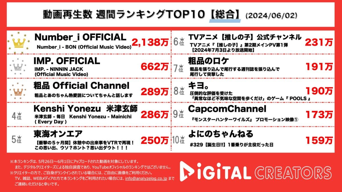 今回は、5月26日から6月1日にYouTubeで公開された動画の再生回数ランキングを発表(6月2日集計)。