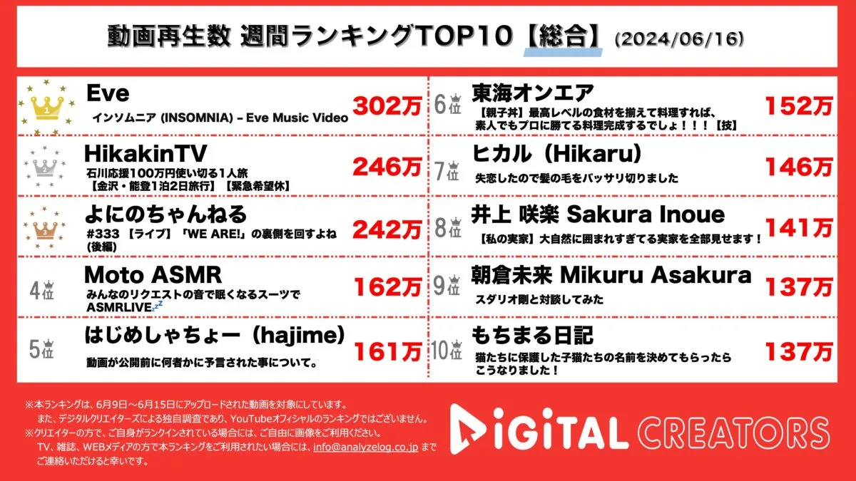 今回は、6月9日から15日にYouTube上で公開された週間動画総合ランキングを発表。(6月16日集計)