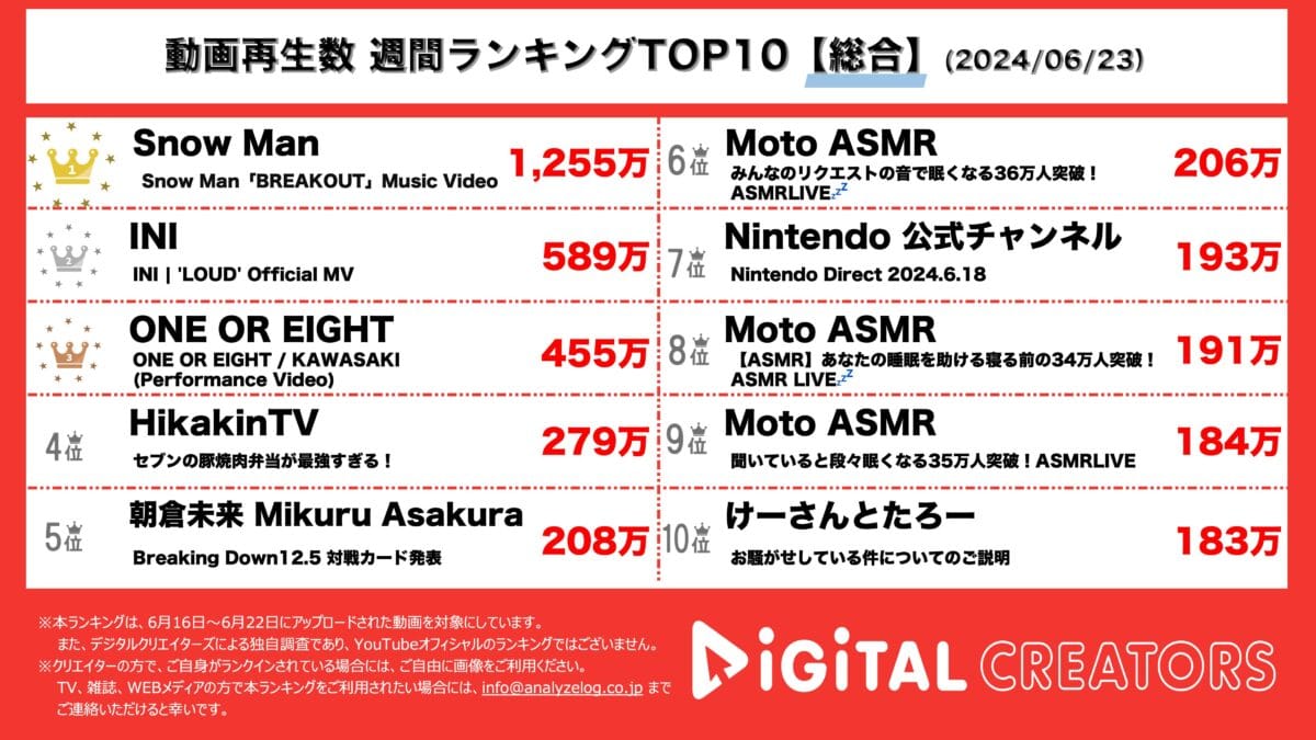 今回は、6月16日から6月22日にYouTubeで公開された動画の総合ランキングを発表(6月23日集計)。