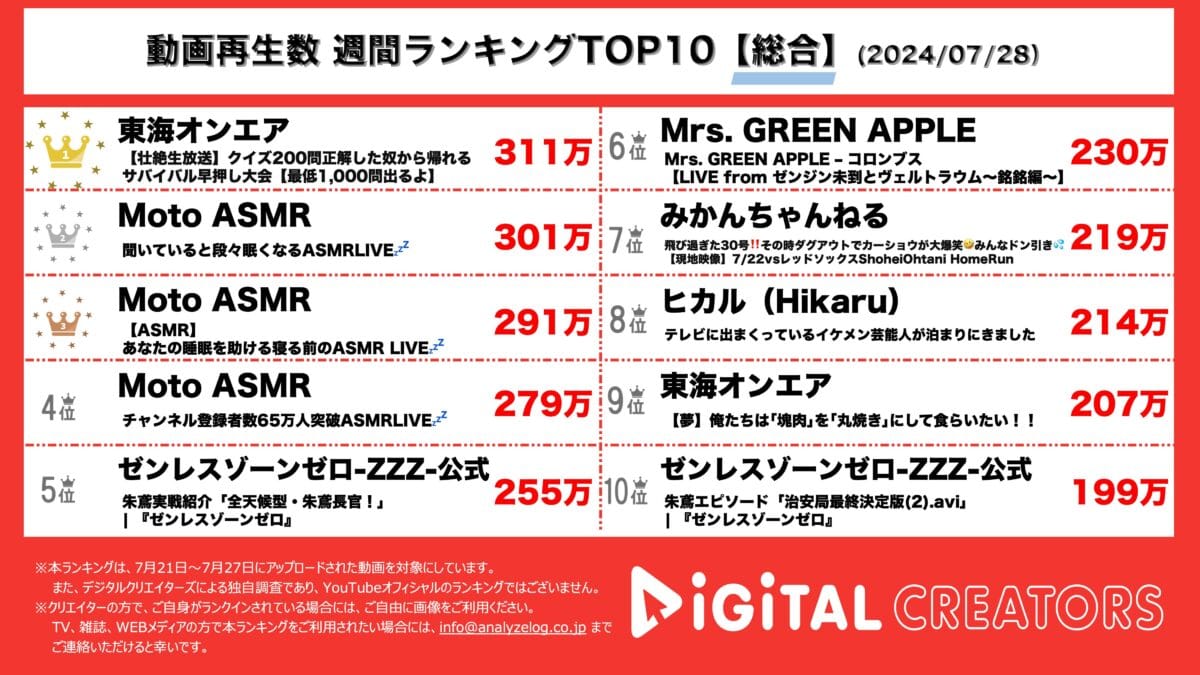 東海オンエア、12時間にも及ぶ生配信クイズ大会に注目!Moto ASMR、ライブ配信動画が人気!ミセス、ヒカルも!【週間総合YouTubeランキング】