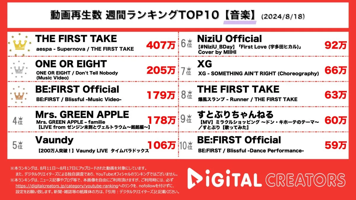 今回は、8月11日〜8月17日に公開された音楽動画の再生回数ランキングTOP10を発表。(8月18日集計)