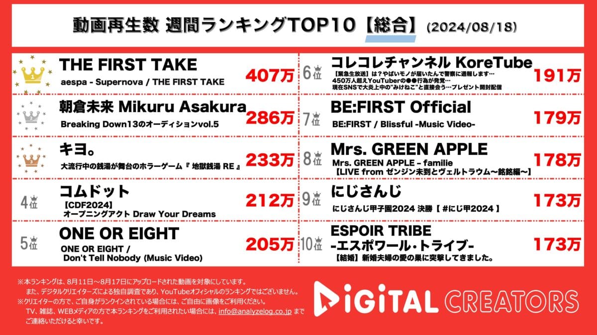 今回は、8月11日から17日にYouTube上で公開された週間動画総合ランキングを発表。(8月18日集計)
