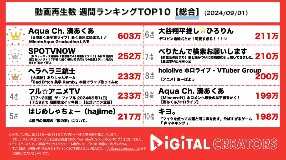 湊あくあ、ホロライブ卒業ライブに合計4660万円の投げ銭!ドジャース大谷翔平、片手でホームラン!ヘラヘラありしゃん、大人気インフルエンサーとラップに挑戦!はじめしゃちょー、キヨも!【週間YouTube総合ランキング】