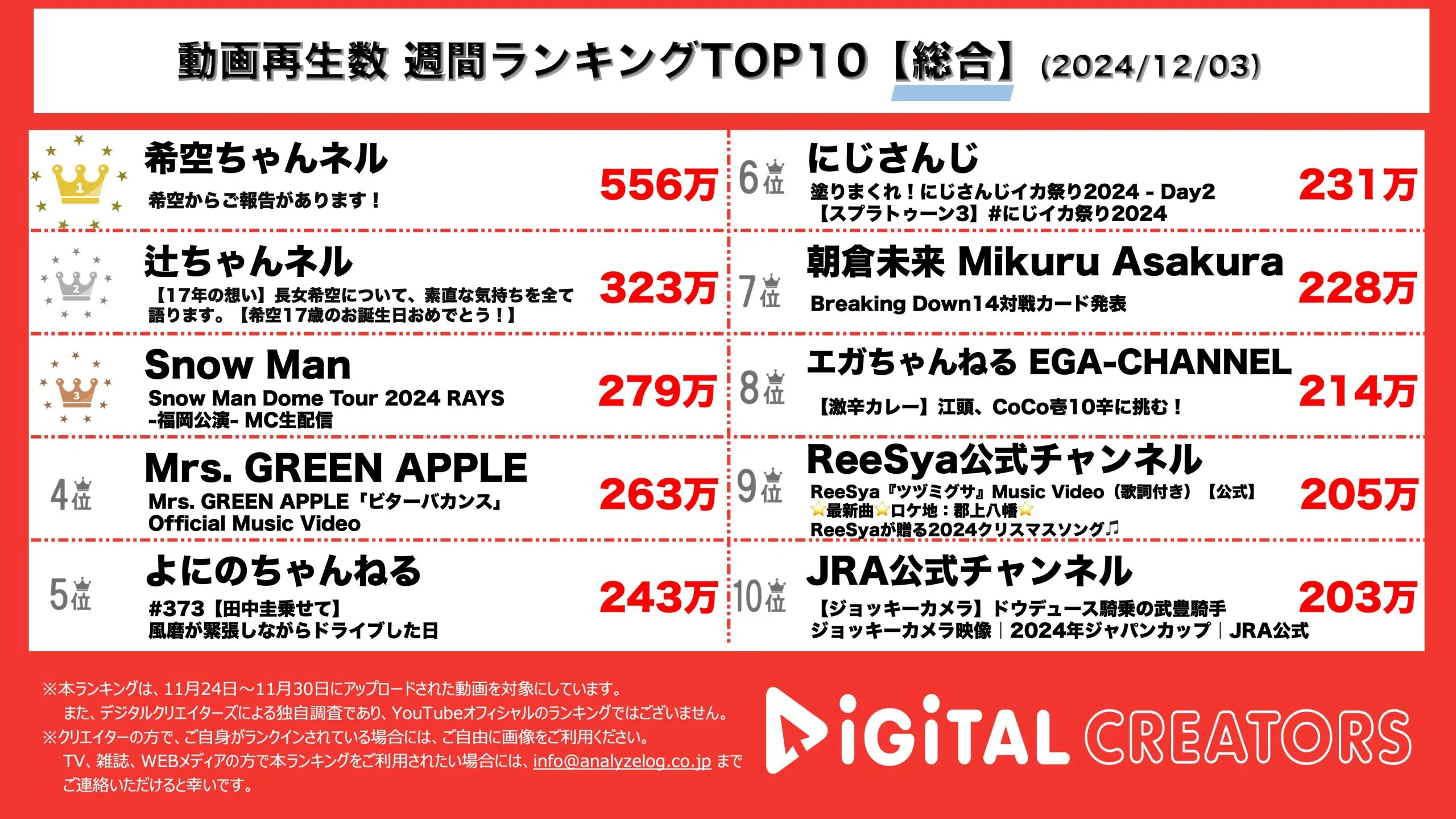 今回は11月24日~11月30日に投稿されたYouTube総合ランキングを公開。(12月3日公開)
