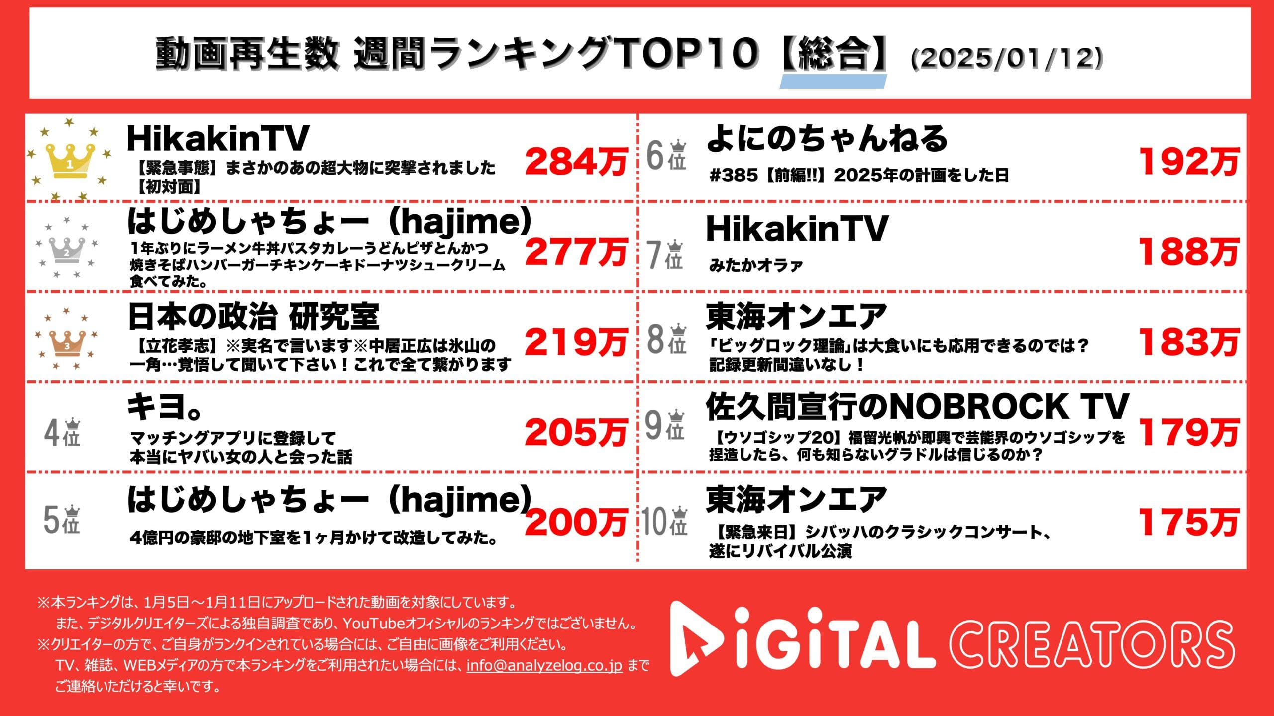 今回は1月5日~1月11日にYouTubeで公開された動画ランキングTOP10を発表。(1月12日集計)