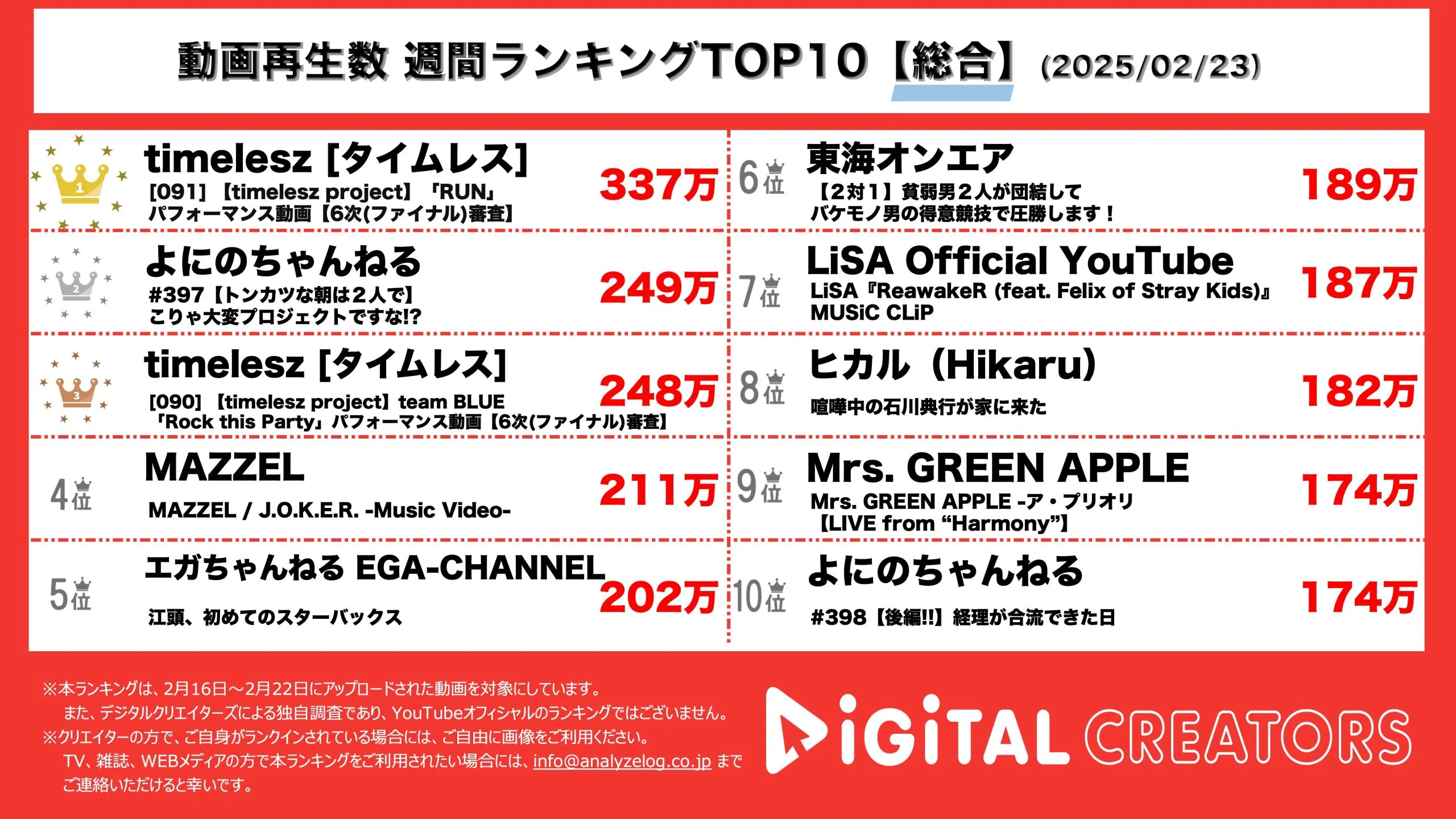 週間YouTube総合再生回数ランキングを発表!「timelesz project」、遂にメンバー決定!「RUN」、新曲「Rock this Party」パフォーマンス映像公開!よにのちゃんねる、後輩ペアで朝とんかつ⁉