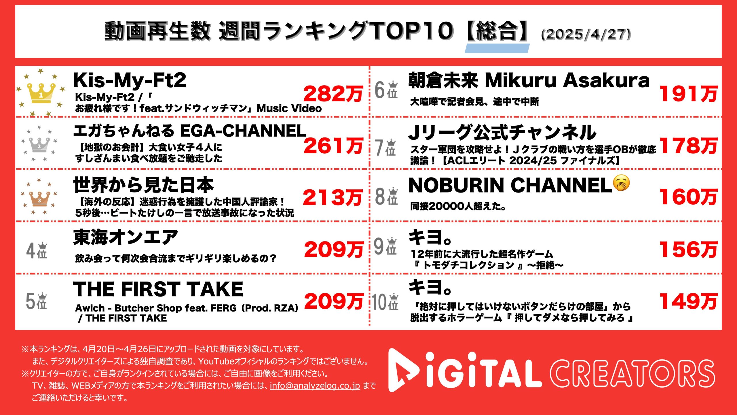 今回は4月20日~4月26日にYouTubeで公開された動画ランキングの総合TOP10を発表。(4月27日集計)