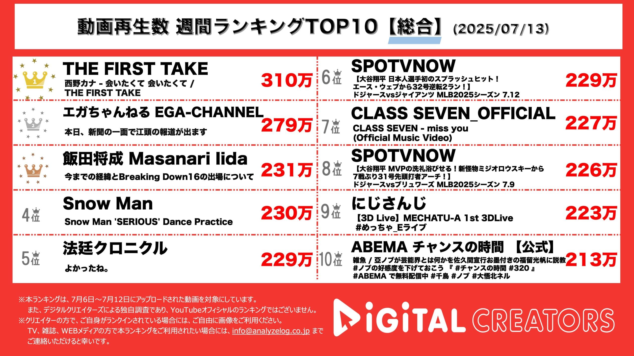 今回は7月6日~7月12日にYouTubeで公開された動画ランキングの総合TOP10を発表。(7月13日集計)