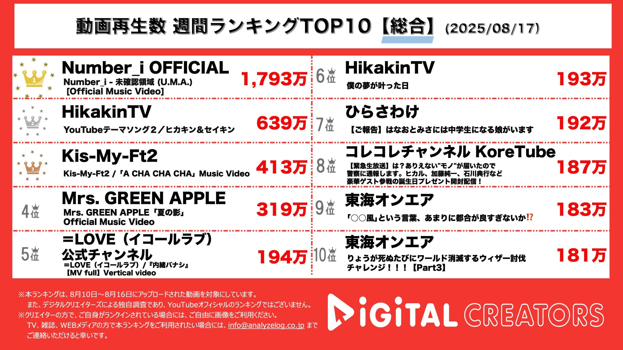 今回は8月10日〜8月16日にYouTube 上で公開された動画の再生数ランキング総合TOP10を発表!(8月18日集計)