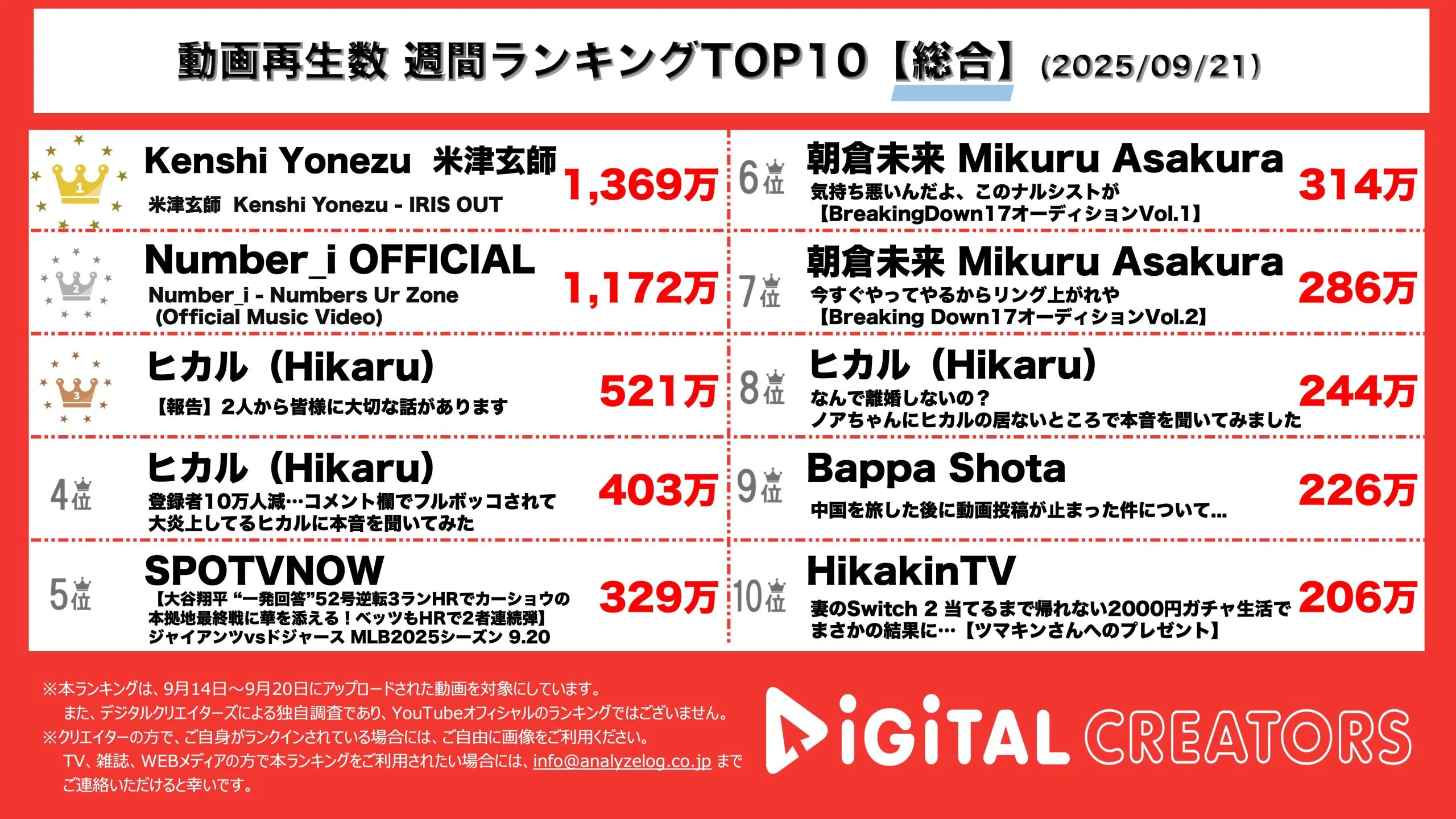 今回は9月14日~9月20日にYouTubeで公開された動画ランキングの総合TOP10を発表。(9月21日集計)