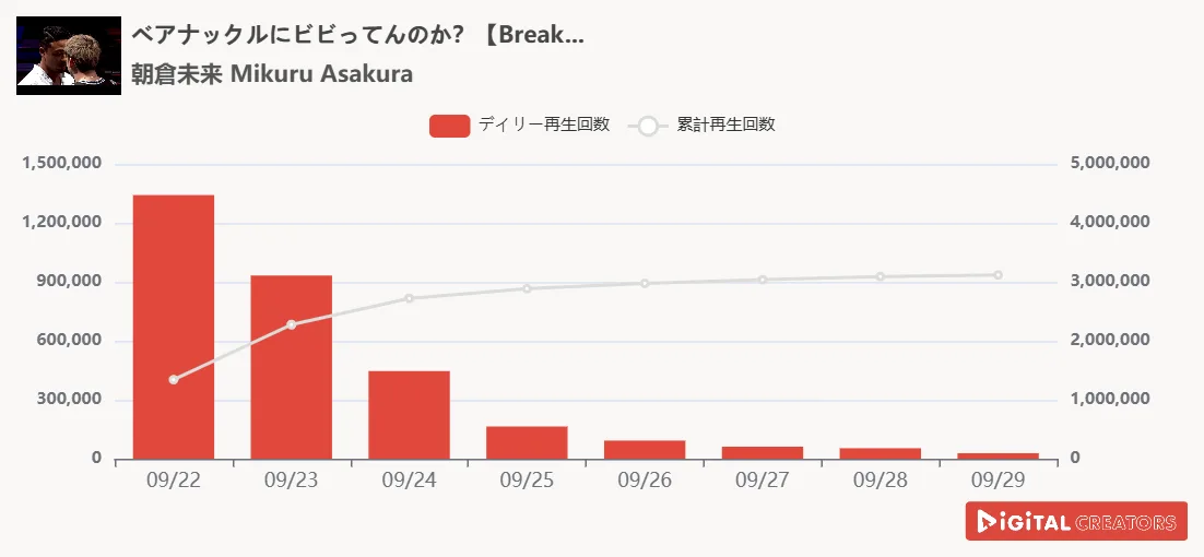 2位、3位を獲得したのは『朝倉未来 Mikuru Asakura』。総合格闘家・YouTuberである朝倉未来がCEOを務める運営会社が行う総合格闘技イベント・「Breaking Down Vol.17」のオーディション動画が公開された。「Breaking Down Vol.17」は9月27日に開催され、注目を集めた。