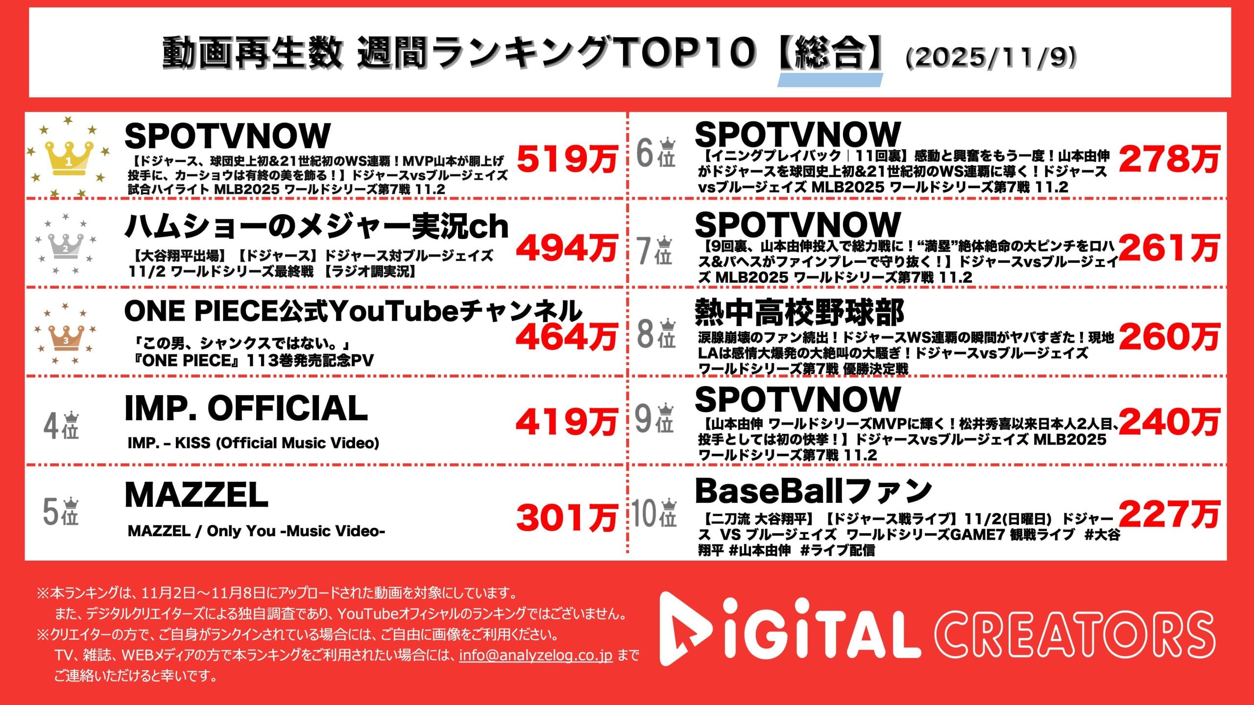 TOP10の動画のうち、7動画がMLBワールドシリーズ関連となっており、注目度の高さが窺える。